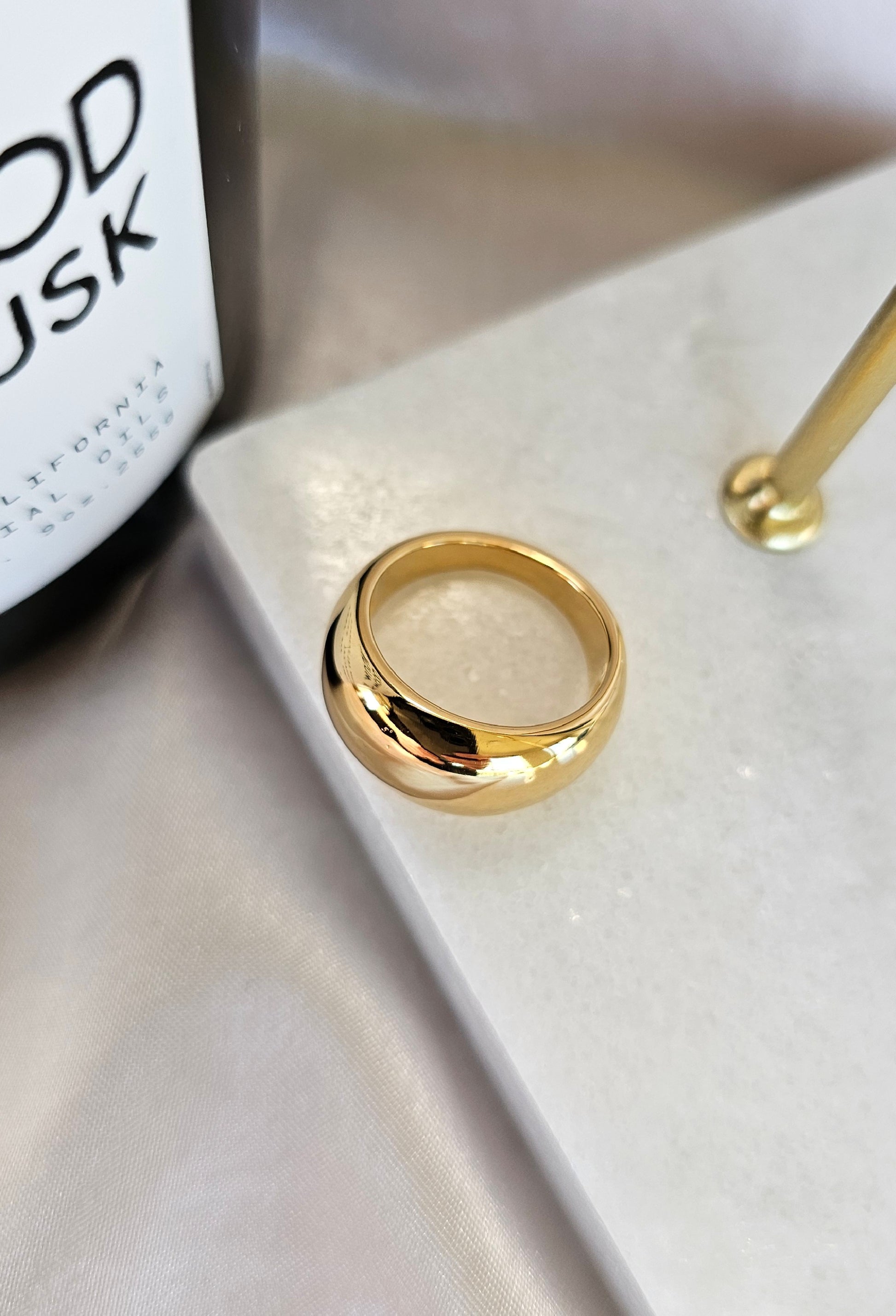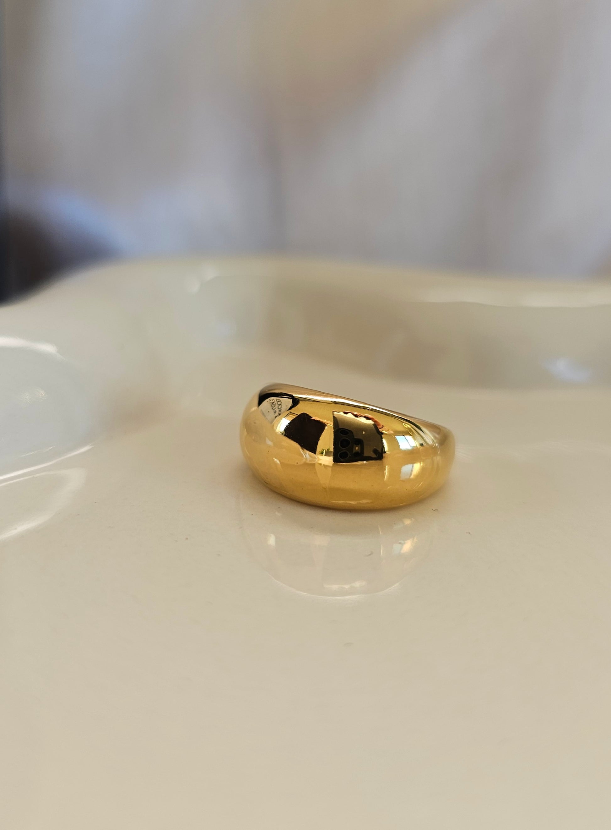 A sleek band ring with a smooth, rounded finish, crafted with radiant 18K gold plating. Its minimalist yet bold design makes it a timeless essential, perfect for everyday wear or effortless stacking.