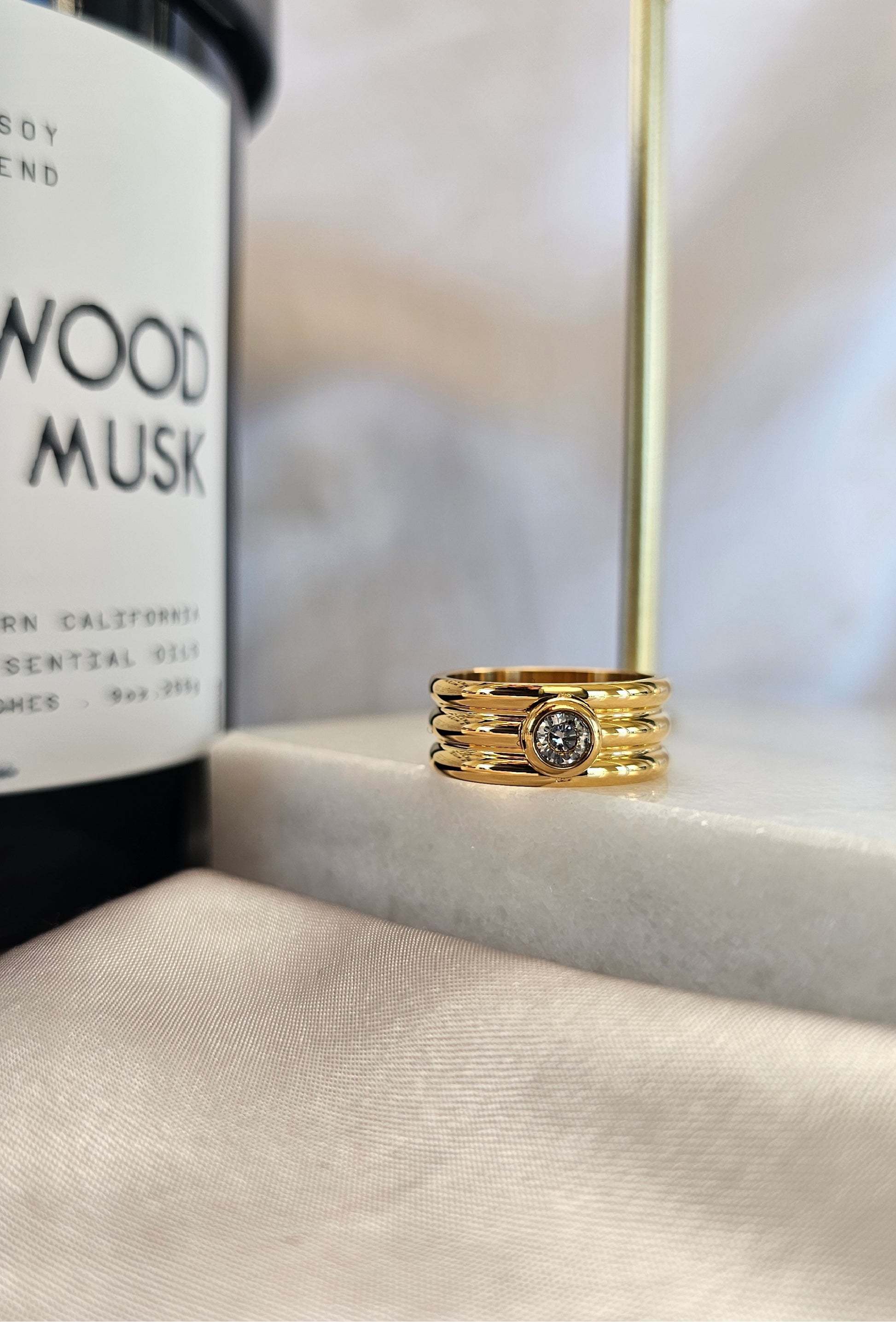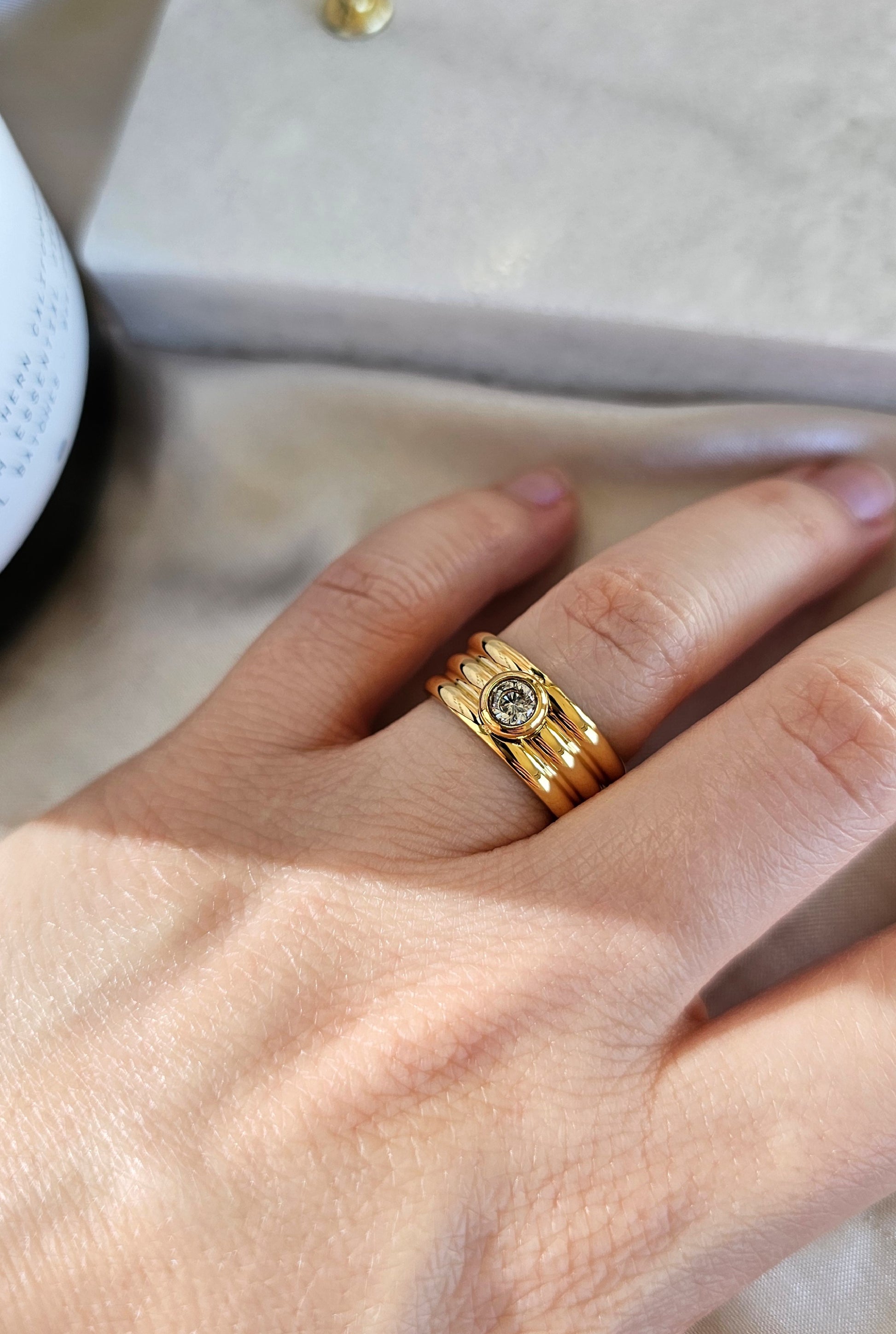 A refined stacked ring design featuring a delicate center stone, finished in radiant 18K gold plating. Its layered silhouette adds a subtle sparkle and modern elegance, making it perfect for everyday wear or a sophisticated statement.