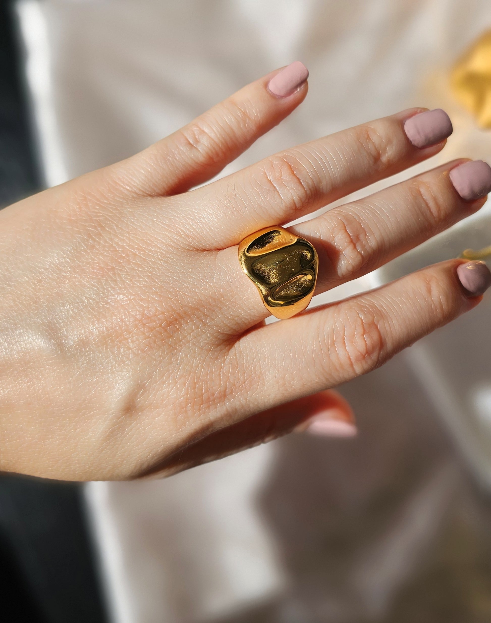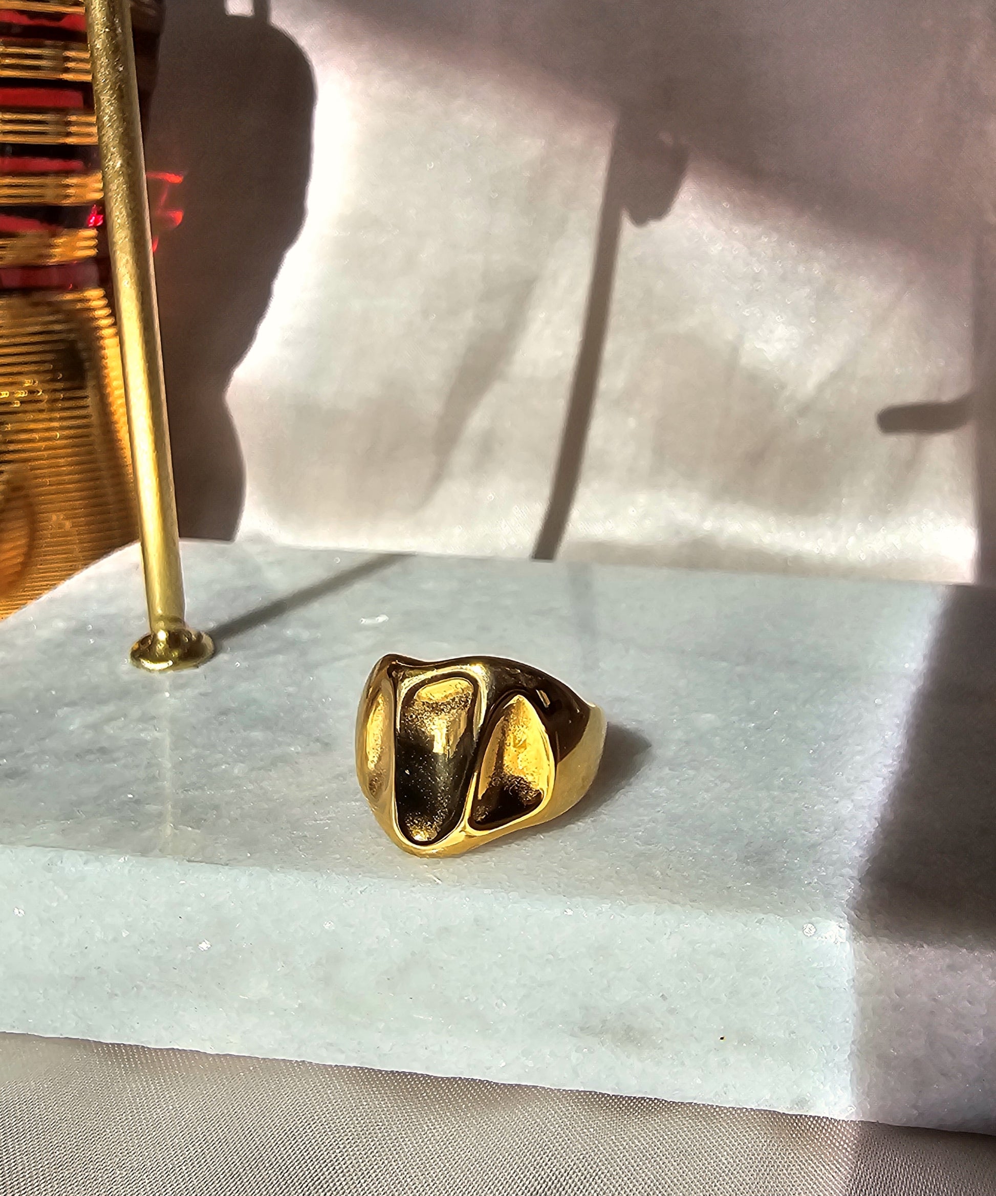 Bold gold-tone ring with a sculptural, organic design that makes a statement. A modern pieces that adds sophistication to any look.