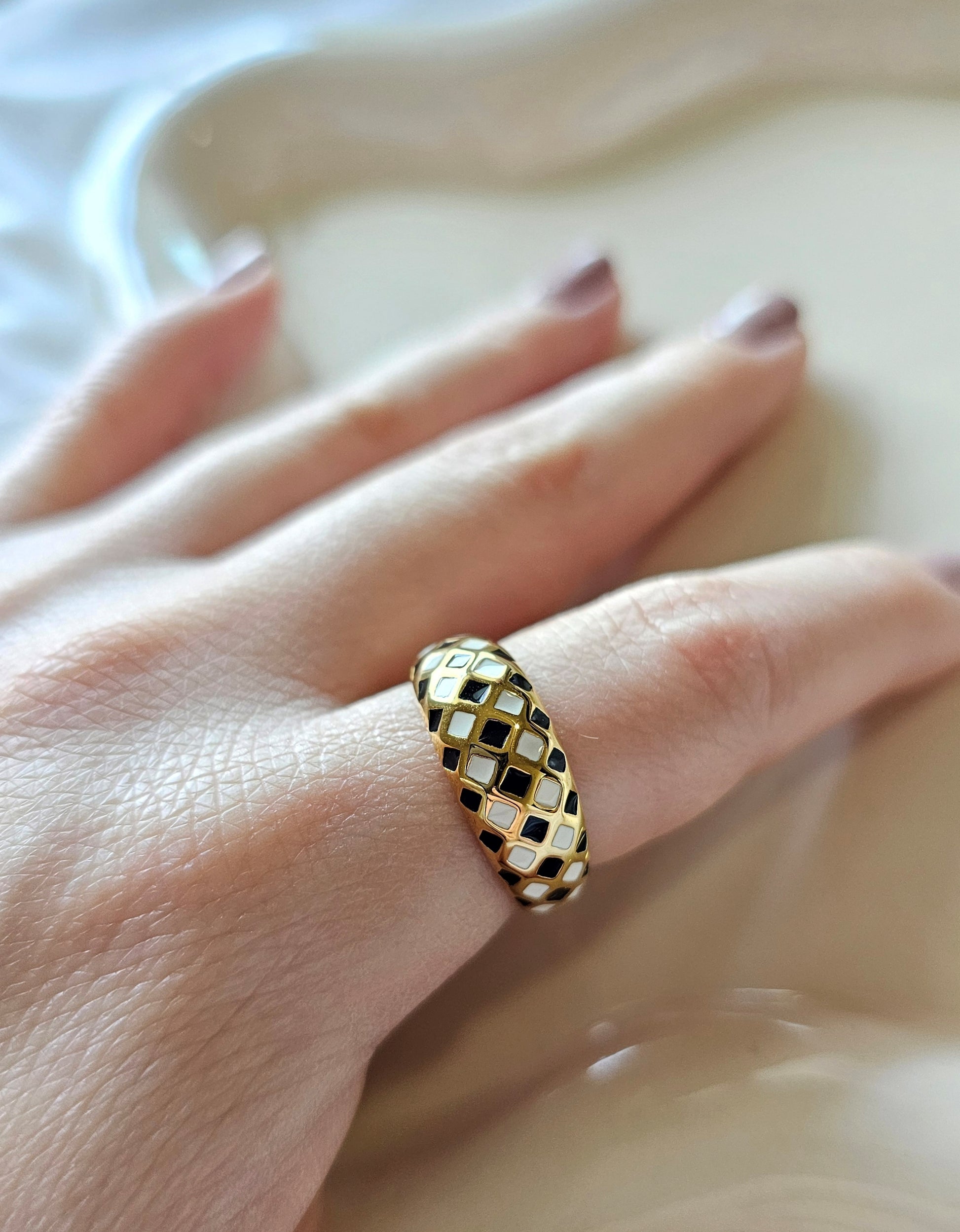 Gold-tone ring with a black and white checkered enamel design, combining elegance and a bold, modern touch.
