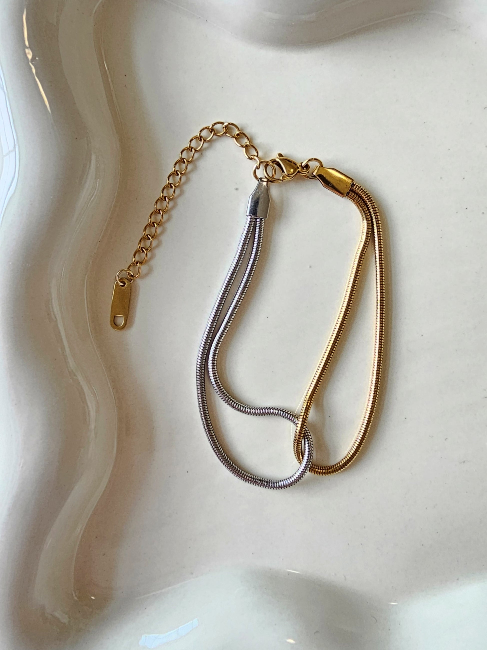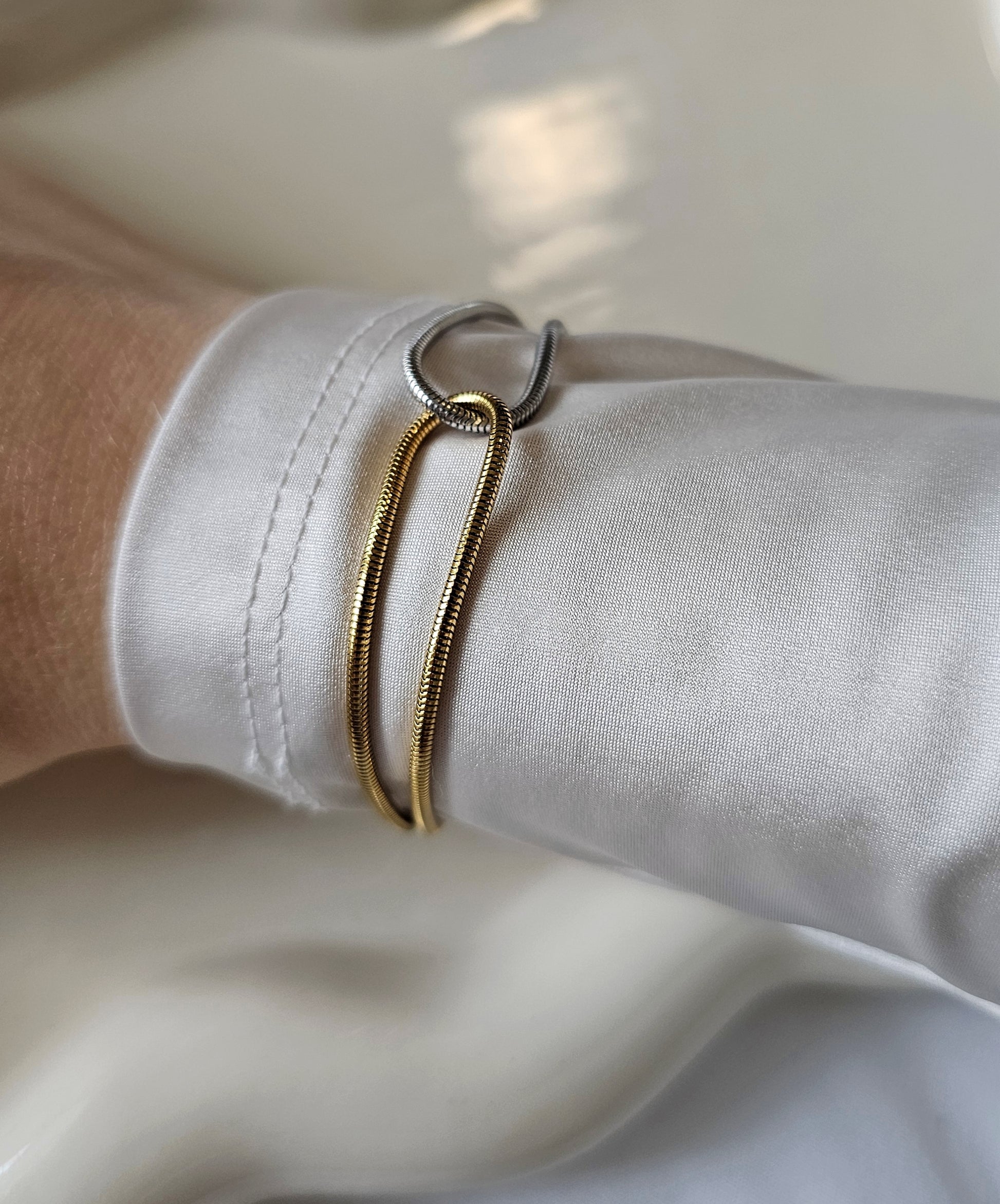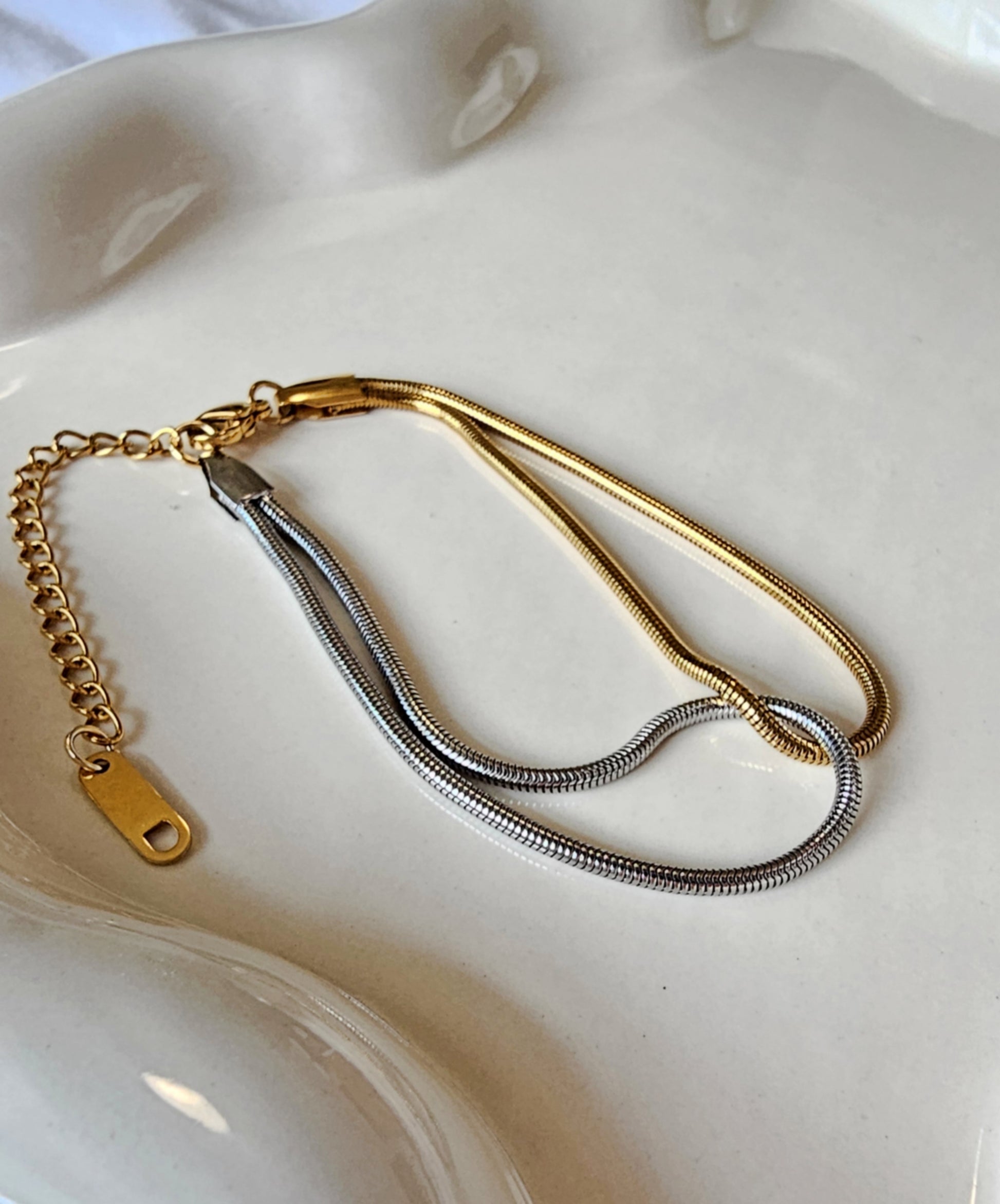A sleek, contemporary design blending gold and silver tones in perfect harmony. A versatile piece that adds a touch of modern sophistication to any look.