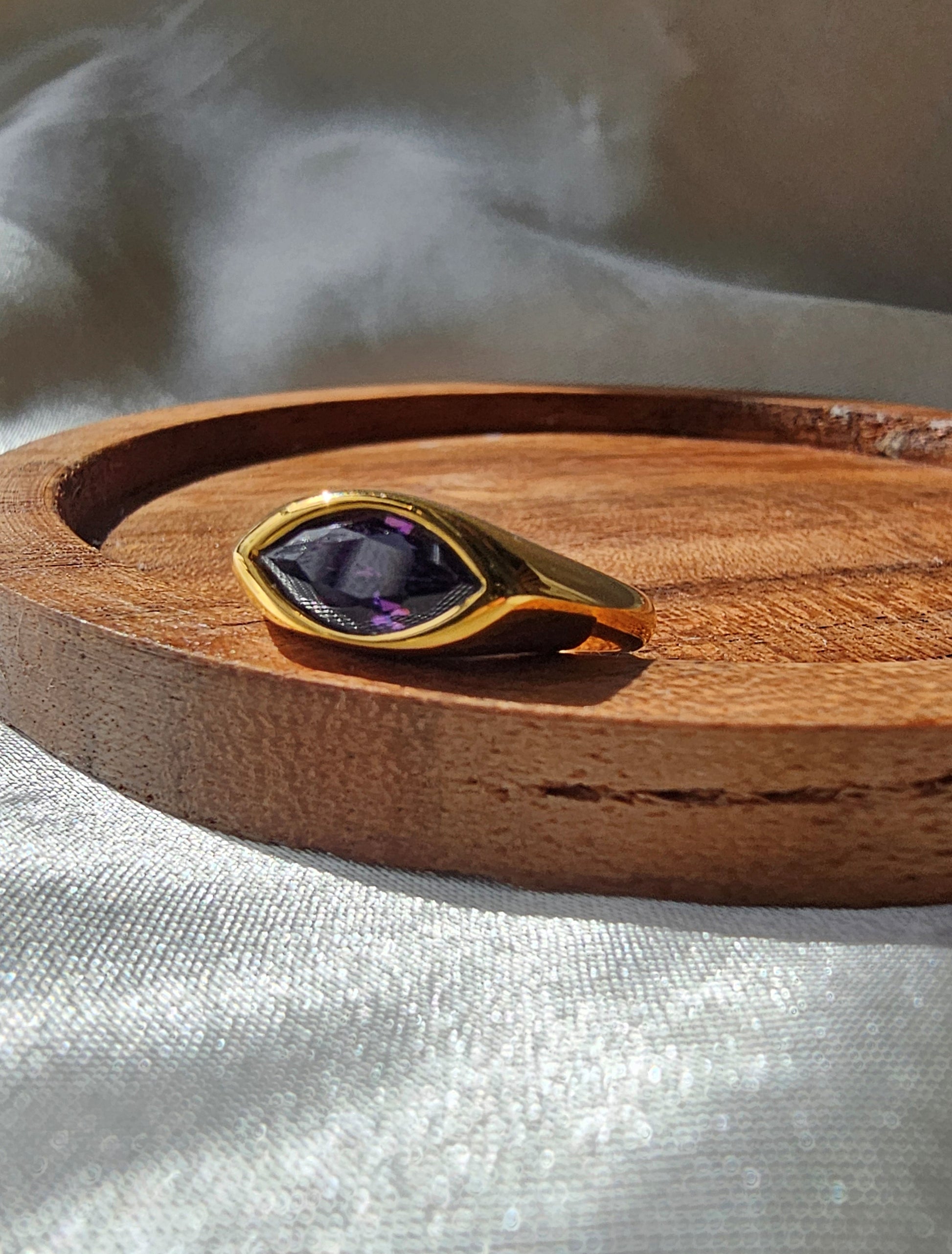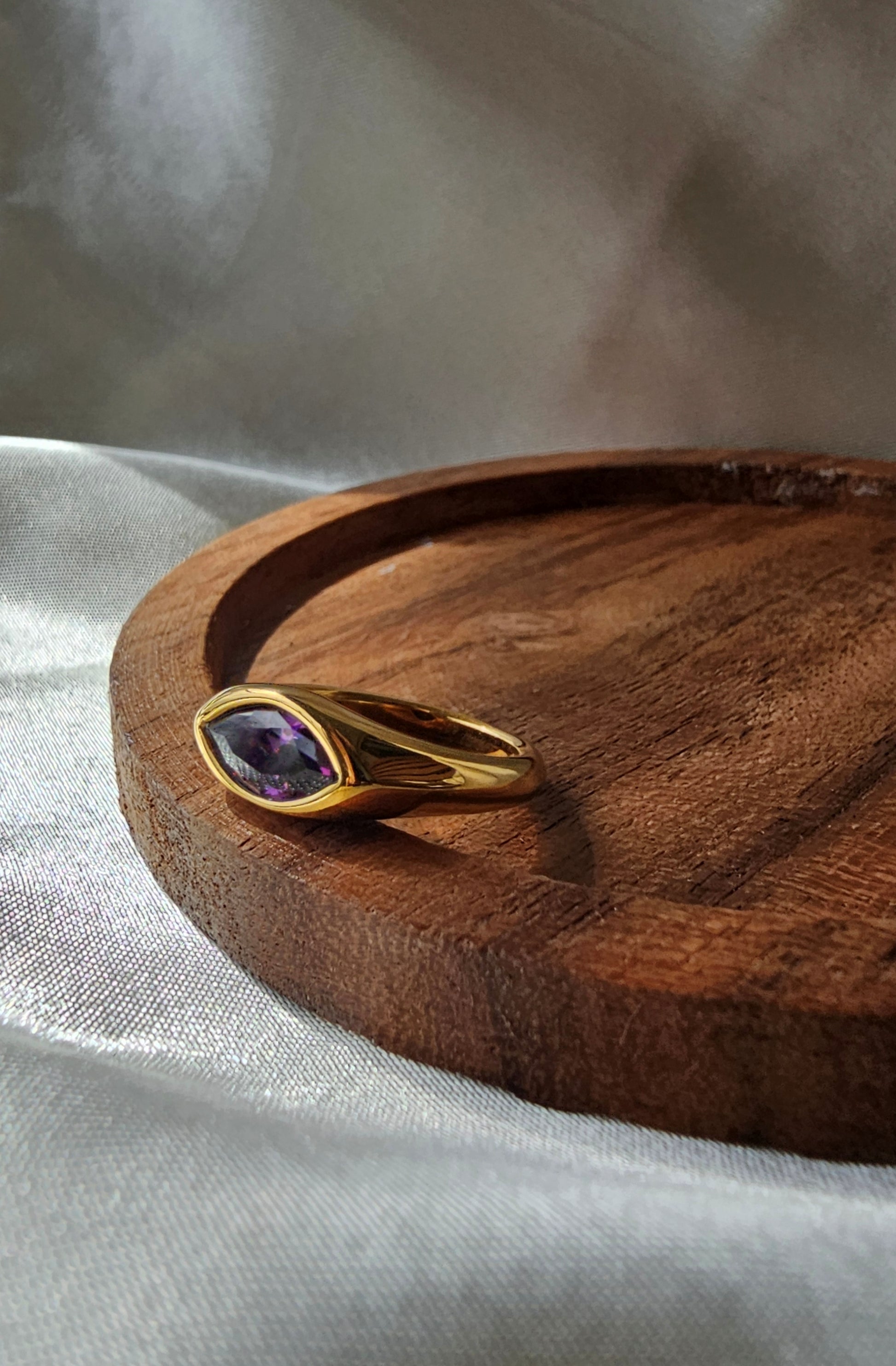 A bold and elegant ring featuring a deep purple gemstone framed in gold. Mysterious, modern, and effortlessly chic.