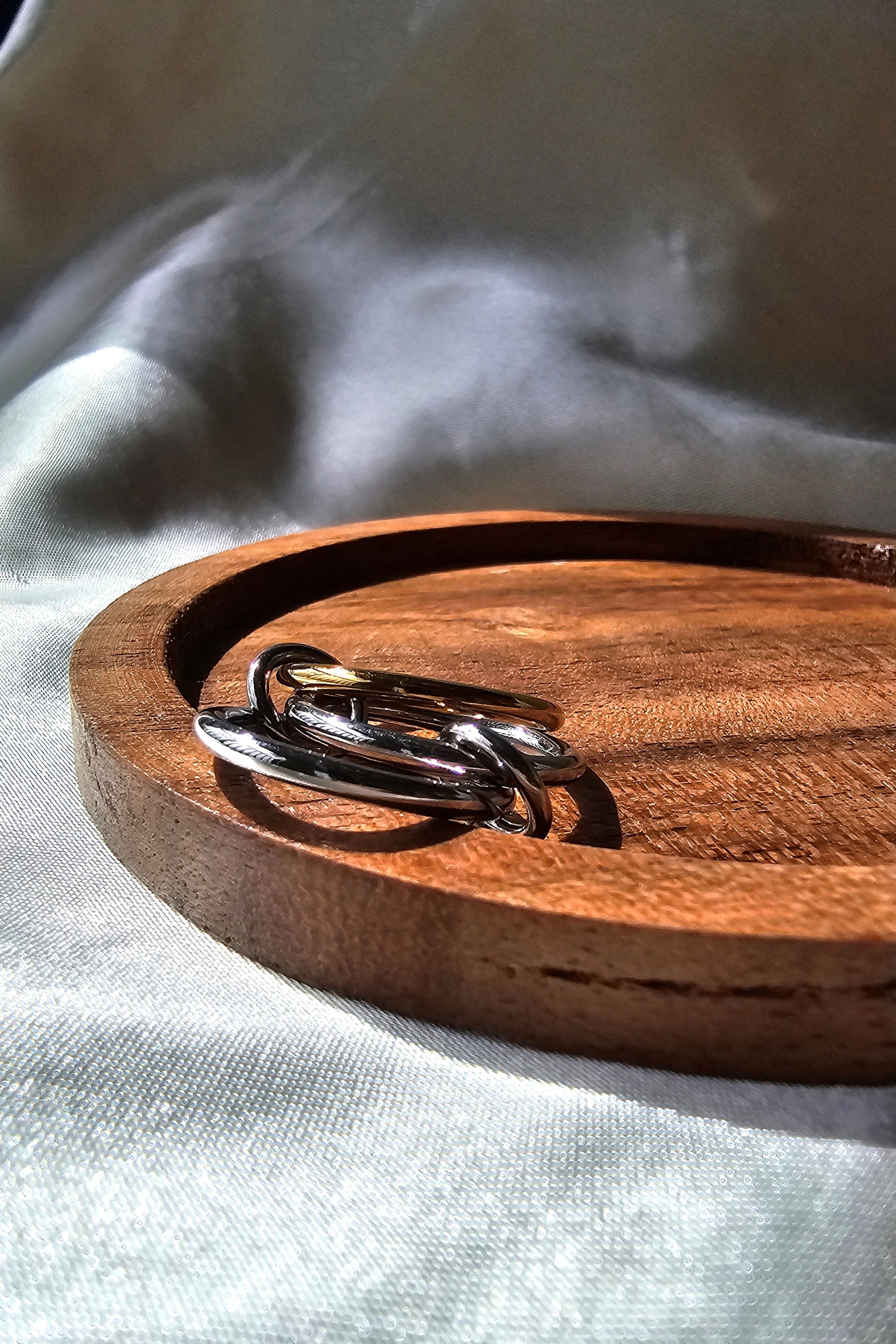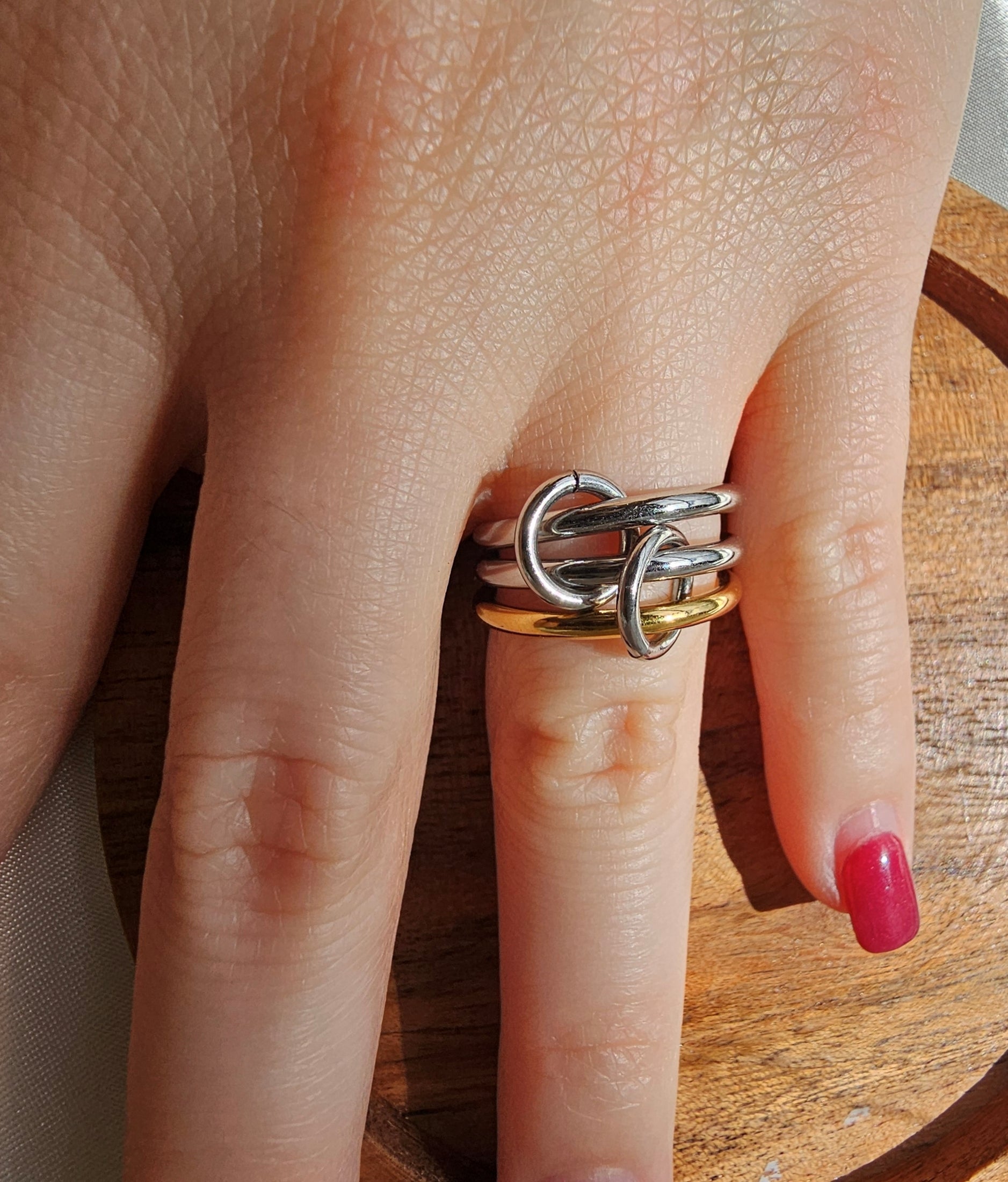 Two-tone intertwined ring featuring silver and gold tones, designed for a modern and elegant look.